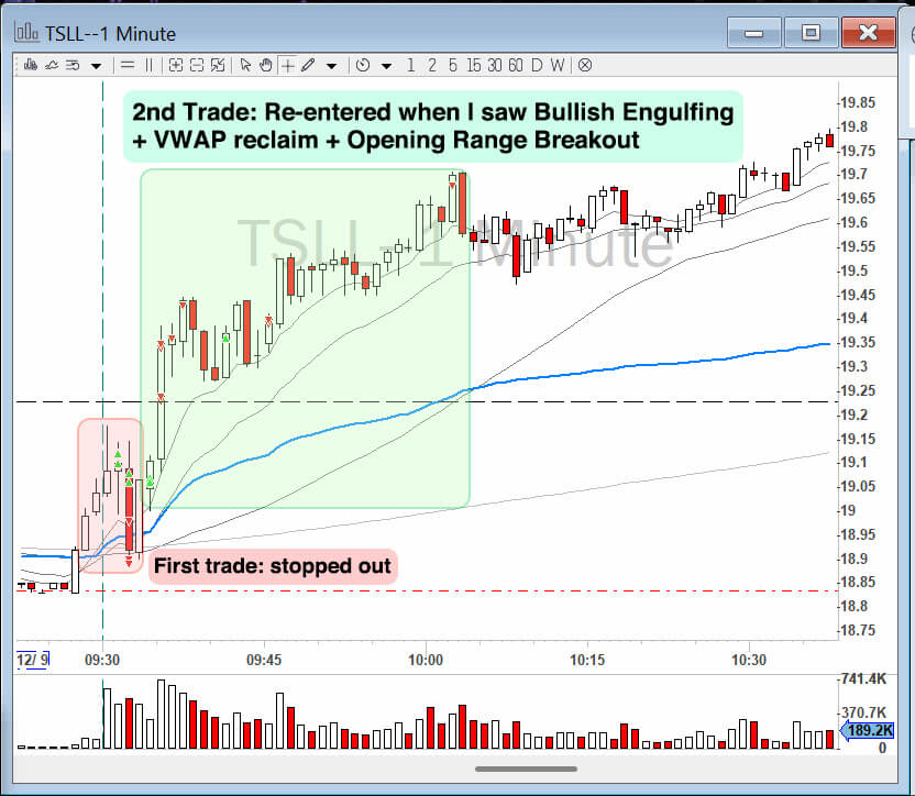 Most stocks were selling off or chopping up and down during the opening hour today. But Tesla was a beauty in its own world. I was watching it this morning because it was oversold yesterday due to an analyst downgrade news. I entered my first trade using the 1-Min Opening Range Breakout setup, and it ended up a losing trade that I cut according to my trade book (stop loss below VWAP and Opening Range). Right after I executed my stop loss, I saw a textbook setup that I’m very familiar with: