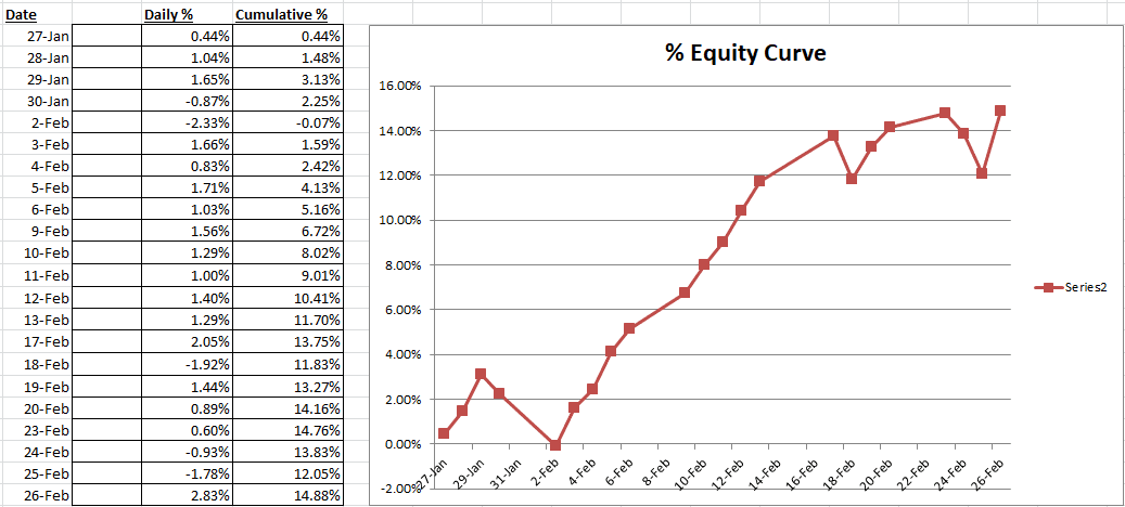 | Justin tried live trading again after finding his consistency in SIM. From Jan 27 to Feb 27, he grew his cash account by 14.88%. |