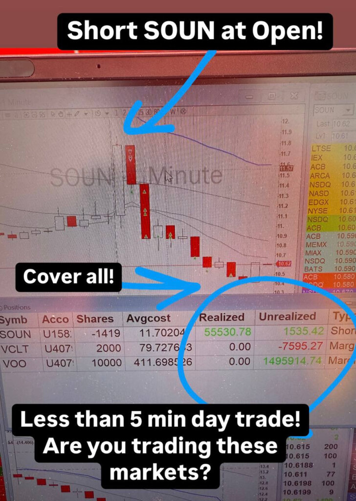 As soon as the market opened, SOUN popped up a little, right into VWAP. I started shorting there, and most of my orders got filled just below VWAP. It never really broke above VWAP, and within the next few minutes, it dropped significantly, just like we expected. I started covering into that drop, locking in some great profits.