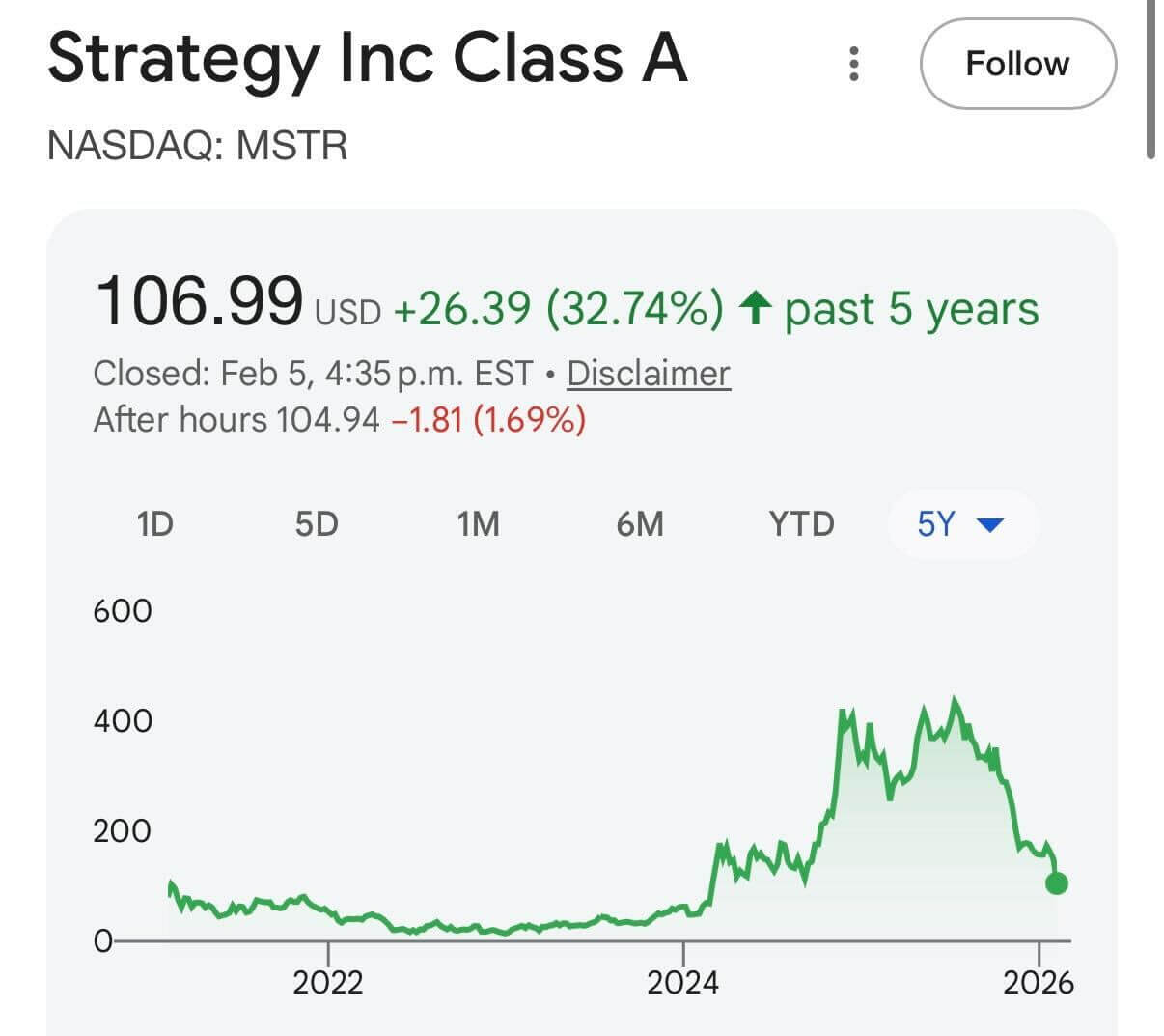 In July 2025, MSTR was trading around the $400s. Now it’s about to break below $100. That’s a 75% crash.