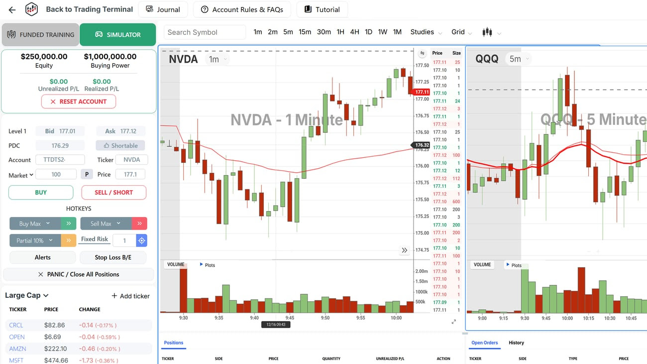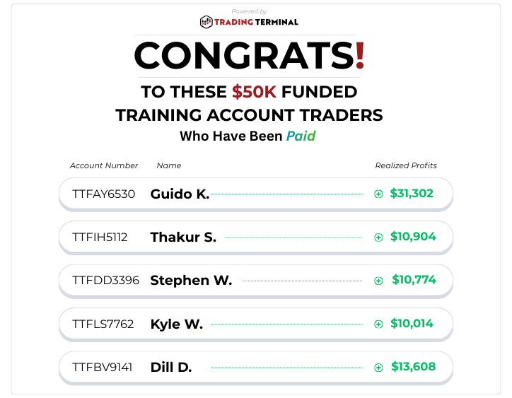 Those 5 traders who received $10,000 payouts started with just a $299 one-time fee to start trading on our real-time funded simulator. Rather than risking $50,000 real capital and taking the financial risk yourself, prove that you can trade consistently first, with real market conditions, real emotions and real-time price action.