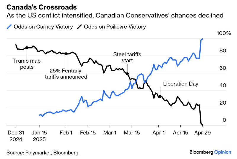 It is fascinating how these events resonate with the recent 2025 Canadian federal election. Just a few months ago, the governing Liberal Party (similar to the U.S. Democratic Party) was trailing in the polls.