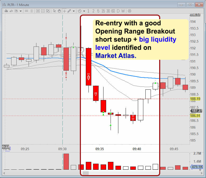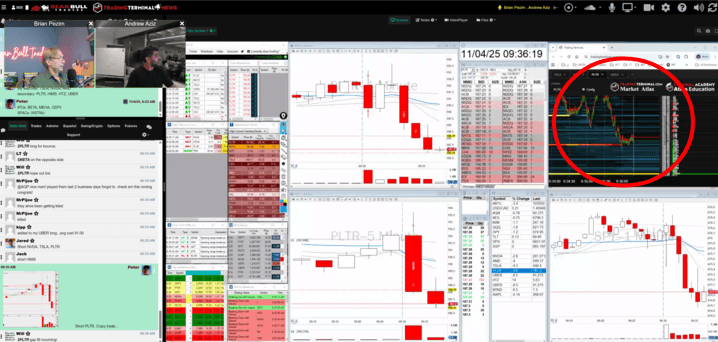I regained control of my emotions, waited for the opening range breakdown to set up, and then entered again on my PLTR short. This trade turned out to be a decent short to a key liquidity level that I saw on Market Atlas. I took profits at the key level, and let my remaining runners stop out at break-even.