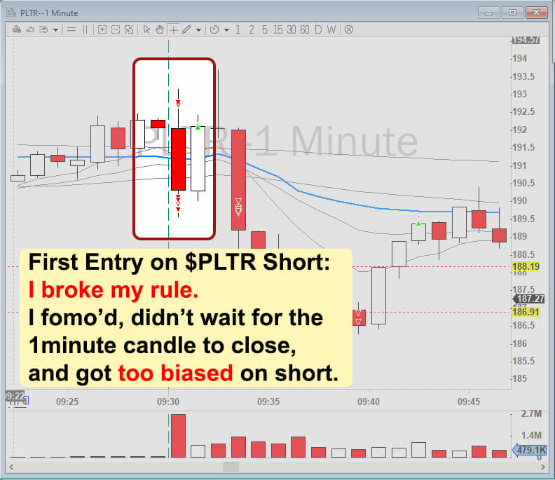 But I made a beginner mistake: I felt the FOMO, broke my rule and started shorting too quick because my bias was too strong. As you can see on the chart above, I had to exit the first trade because there’s sign of PLTR squeezing to a new high.