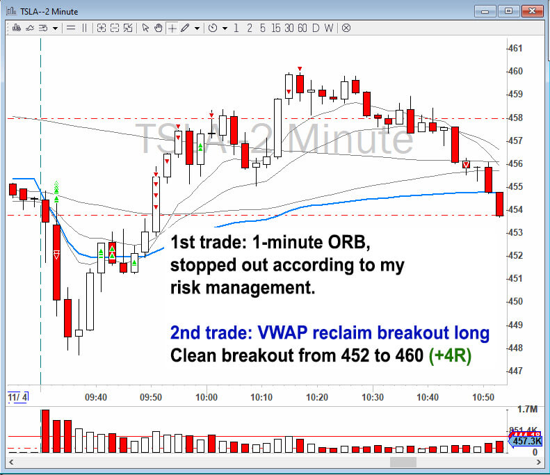The best trade today for me was a VWAP reclaim breakout long on TSLA, also taken within the first trading hour. Initially, I went in long on a 1-minute ORB setup, but got stopped out according to my 1R stop loss (good disciplined trade). Then, I saw the VWAP reclaim, forming a clean reversal pattern for me to re-enter, scaling out all the way from $452 to $460 (a +4R trade).