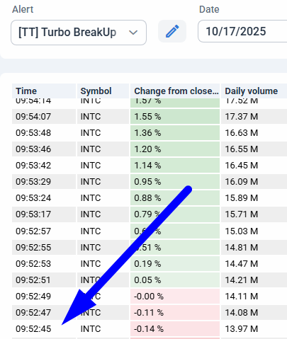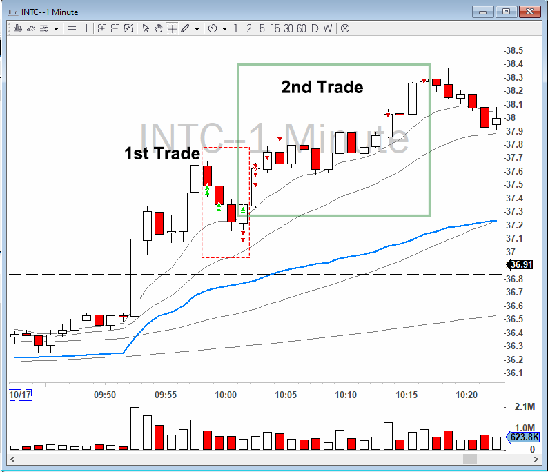 I traded $INTC (Intel stock) live in the Bear Bull Traders chatroom this morning. I was actually alerted to look at $INTC as they had a breaking news announced by the live audio news on Trading Terminal. Then I quickly looked at our strategy scanners, and confirmed that $INTC was trading on a break-out volume under the ‘break up’ scan.