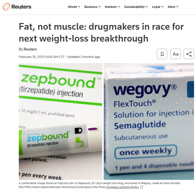 Here’s a Reuters article that talks about this new direction in weight loss treatments in the article “Fat, not muscle: Drugmakers race for next weight-loss breakthrough.”