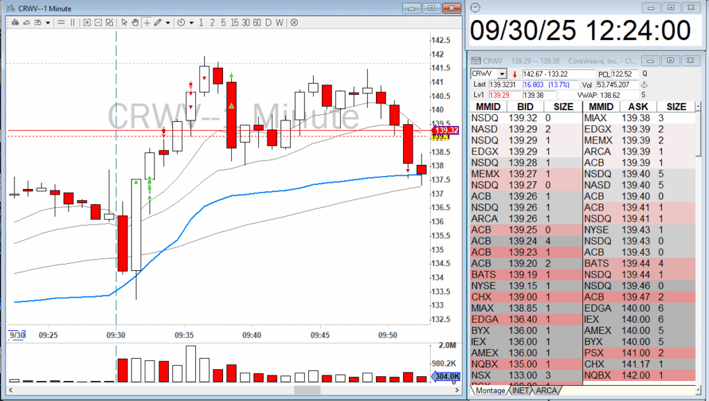 $CRWV was my bread-and-butter setup. It was a 1-minute Opening Range Breakout combined with a bullish engulfing pattern. This stock was added to the BBT premarket watchlist following a very bullish news catalyst: CoreWeave signed a $14 billion deal with Meta. I took the long setup and quickly scaled out, and re-added a small size with my stop loss moved to break-even. Keep in mind that both SPY and QQQ were heavy at the open when I went long on $CRWV.