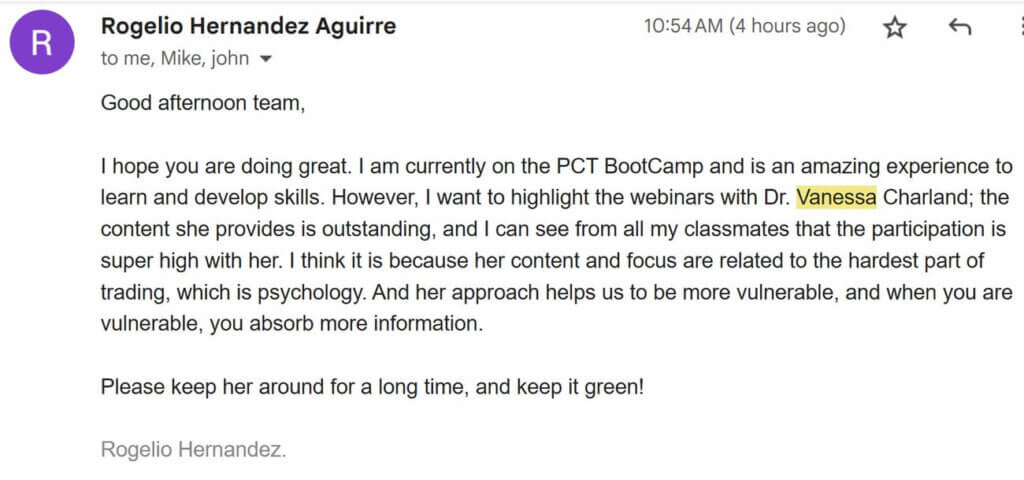 I hope you are doing great. I am currently on the PCT BootCamp and is an amazing experience to learn and develop skills. However, I want to highlight the webinars with Dr. Vanessa Charland; the content she provides is outstanding, and I can see from all my classmates that the participation is super high with her. I think it is because her content and focus are related to the hardest part of trading, which is psychology. And her approach helps us to be more vulnerable, and when you are vulnerable, you absorb more information.
