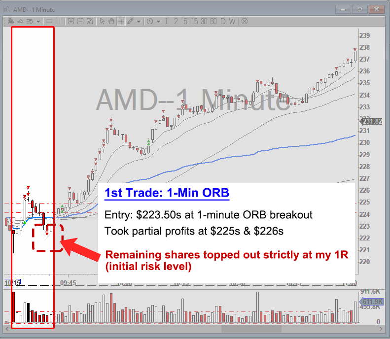 1st trade, 1-min ORB Long: Took partials at 2R, stopped out my remainder at the initial stop loss level.