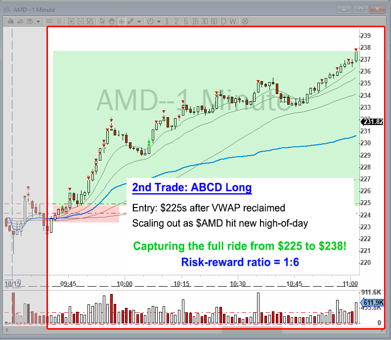 2nd trade, ABCD Long: Re-entered as soon as I saw the setup, with VWAP reclaimed, leading to a really strong uptrend (from $225 to $238!)