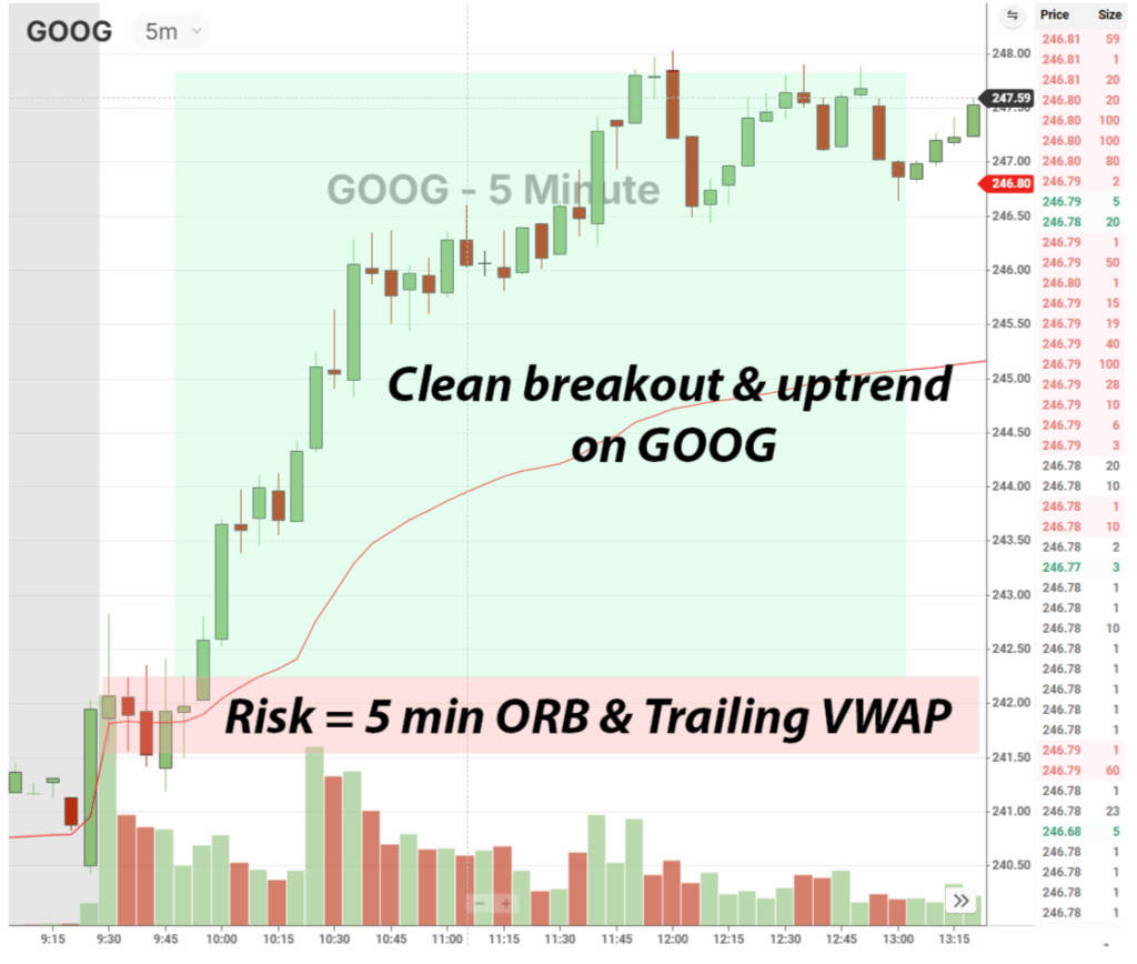 After the initial sell-off, the market gives us multiple high risk-reward Reversal Long setups. From all of our members’ trades today, I think the best long setup of the day is GOOG. GOOG was a very clean 5-Minute ORB + VWAP Breakout trade.